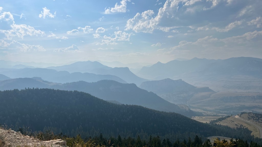 Once you leave Red Lodge and head towards the Beartooth Pass, the road starts climbing and you see stunning views all around. The road is in great condition and wasn’t too busy. There were a few road works but generally the road was perfect (this in early September 2024). The skies were hazy at lower altitudes due to forest fires in Idaho but there were blue skies at higher altitudes but then wind was a problem. Anyway as you climb the scenery just keep getting better. The road twist and turns and keeps climbing non-stop till you summit the pass at 10,947 feet. The ride was perfect and the best ride I’ve ever ridden. The Beartooth Pass is in Wyoming while most of the ascent is in Montana.